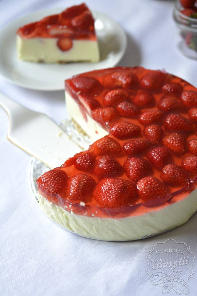 Po tym czasie na wierzch sernika wykładamy truskawki i zalewamy galaretką truskawkową. Całość wstawiamy do lodówki na kilka godzin do stężenia.